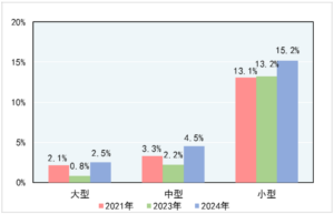 国家市場監督管理総局が公表した公式統計データによると、2024年度の全国製品品質監督・抜き取り検査では、不合格率は14.3%でした。企業規模の内訳を見ると、上表の通り中小企業が15.2%と、最も高い割合を示しています。