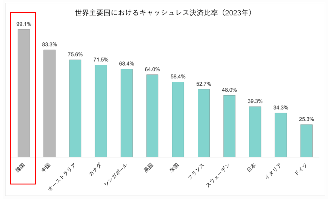 下記は世界各国のキャッシュレス比率を比較したグラフです。実は韓国のキャッシュレス比率は99.0%と世界で最も高い比率を誇ります。