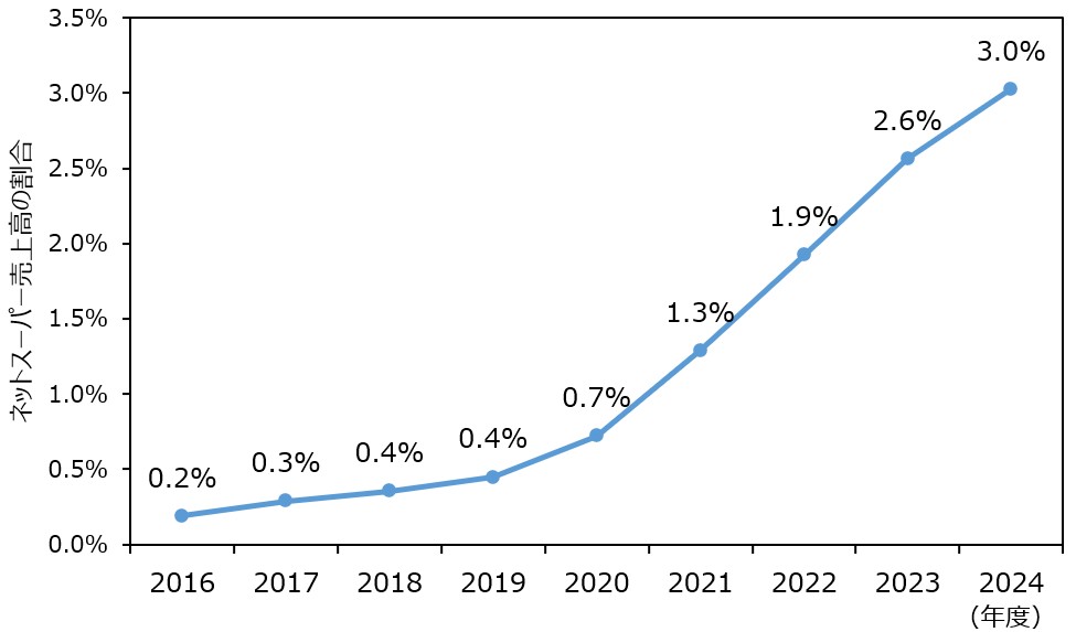 コロナ禍前には、全社売上高に占めるネットスーパー事業の割合は1%に満たなかったものの、その後着実に拡大し、2024年度には3%に到達しています。