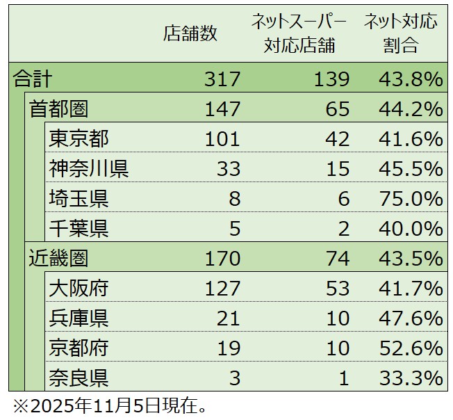 上の表にあるように、2025年11月5日現在、同社の全店舗の40%強がネットスーパーに対応しています。