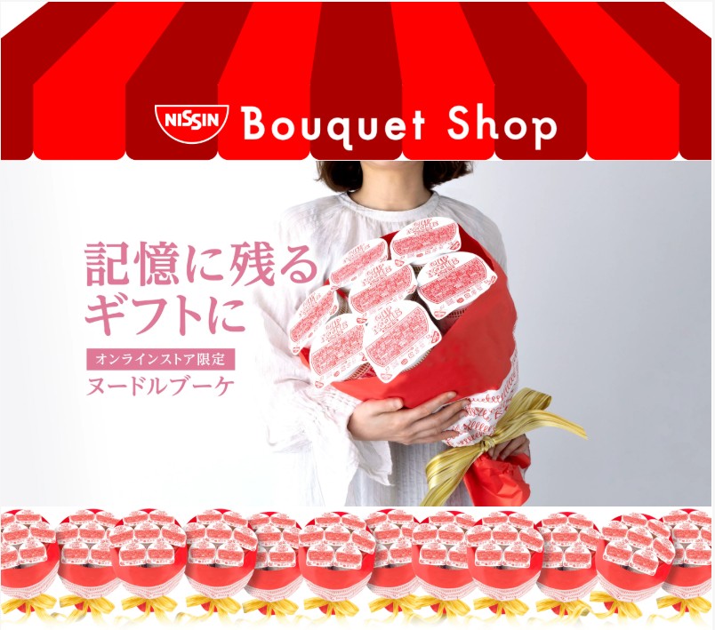 また、ECサイトでは、同社を代表する商品である「カップヌードル」でつくった花束の「ヌードルブーケ」というアイデア商品を販売しています。