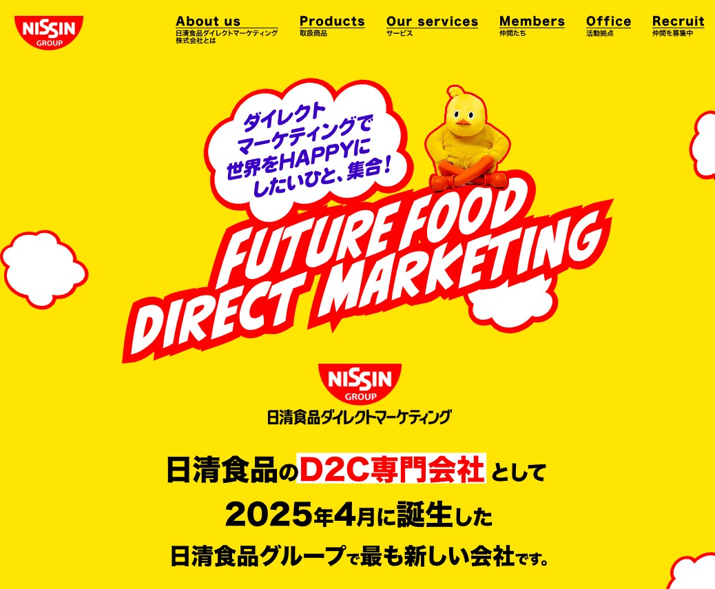 日清食品ダイレクトマーケティング公式ウェブサイトの事業内容には「食品、健康食品、化粧品の企画・開発および販売」と書かれていますが、ページの上部には、「D2C専門会社」と明示されて、更に、「新しい食文化を生み出すために日清食品らしく失敗を恐れず可能性を広げスピーディーになんでもやってみる」「世界一面白いダイレクトマーケティングを貪欲に求める集団」とも記されています。