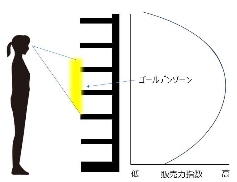 棚の前に立った顧客は、水平よりやや下に視線を向けることが多く、おおよそ腰から胸の高さにあたる棚段が、最も視線に入りやすい位置です。この高さは「ゴールデンゾーン」と呼ばれ、見られやすく販売力が高い優位置とされています。そのため、各カテゴリーを代表するブランドが、多くのフェイスで陳列されることが多いのです。