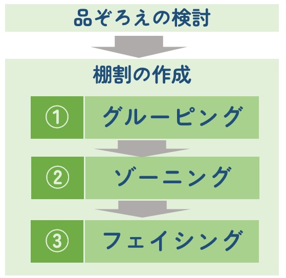 定番売場では、取り扱う商品(品ぞろえ)を決めた上で、「棚割(たなわり)」と呼ばれる考え方にもとづき、商品の配置が設計されています。まず、似たもの同士で分類します(グルーピング)。次に、それぞれの商品群を配置する場所を決め(ゾーニング)、さらに各商品を何列並べるか(フェイシング)を設計します。