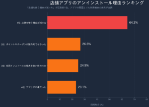 別の調査データでは、「ポイントやクーポンが魅力的でなかった」がアンインストール理由の26.6%を占めています。また、「初回インストールの特典を使い終わった」も24.9%と高い割合です。