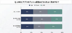 DearOne社が実施した調査(2023年)によると、同一店舗のLINE公式アカウントとアプリの両方を利用しているユーザーのうち、「店舗でよく使うのはアプリ」と回答した割合が全体で最も高い一方、「プッシュ通知をよく見るのはLINE」という結果が出ています。つまり、新規の接点づくりにはLINEが有利ですが、店舗で実際に活用されるのはアプリという使い分けが消費者の間で定着しつつあります。