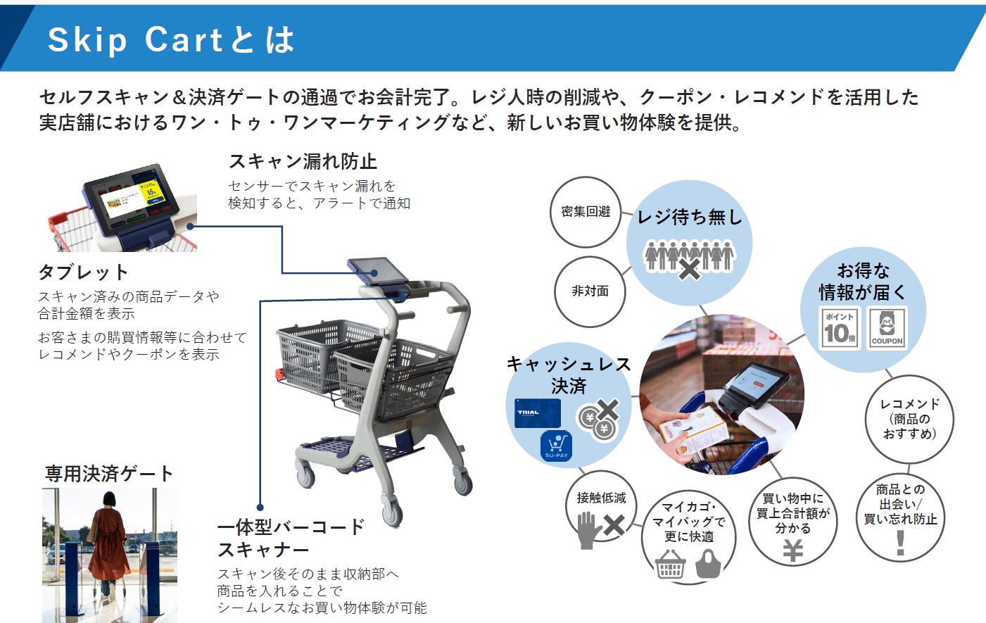 トライアルの売場を象徴するスマートショッピングカート「Skip Cart」は、顧客のレジ待ちストレスを解消することに加え、データ分析により利用者の来店頻度が6.3%向上し、有人レジより約4.2倍効率的であるという具体的な成果を出しています。また、カートのタブレットやアプリを通じて、ID-POSデータに基づく1to1マーケティングを実現しています。