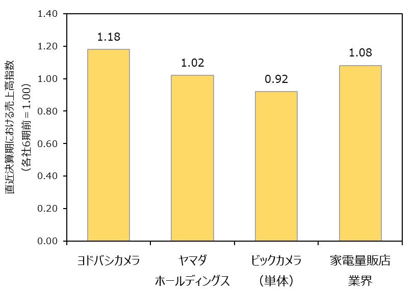 下図は、同社と業界の主要企業であるヤマダホールディングス、ビックカメラ(単体。以下、同様)、および家電量販店業界全体の直近の売上高を、6期前を1.00として指数化したものです。