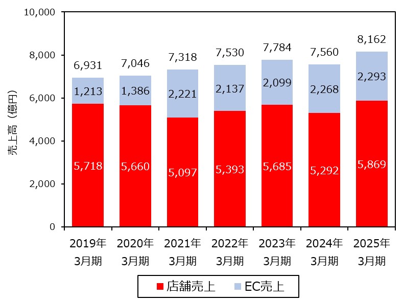 2019年3月期から2025年3月期までの6年間で、店舗売上は微増に留まっているのに対し、EC売上は2倍弱に増加しており、売上成長の中心が店舗ではなくECにあったことがわかります。