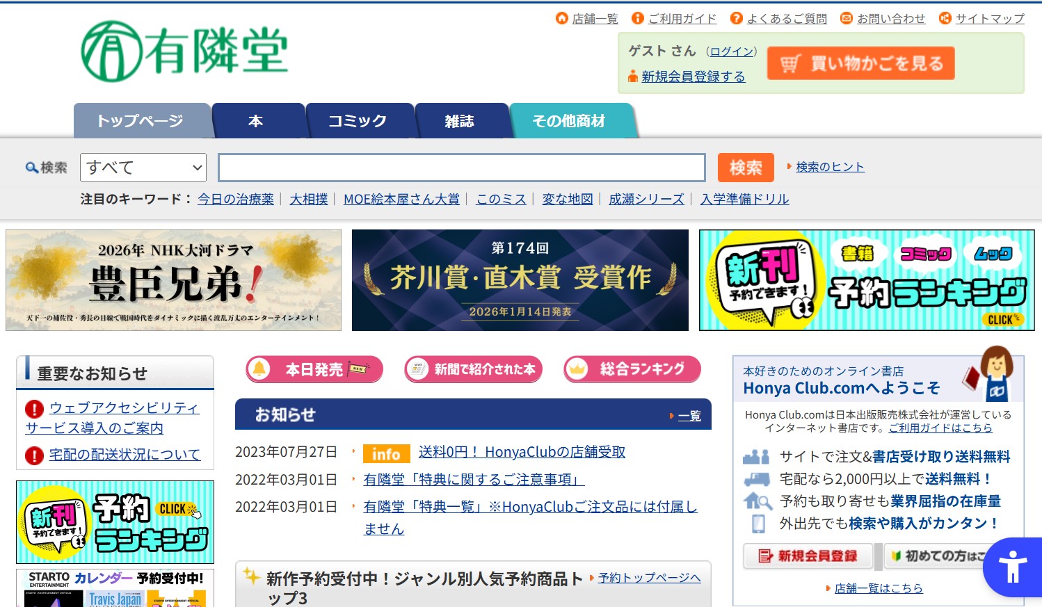 画像出所:「HonyaClub有隣堂」トップページを筆者がキャプチャ(2026年1月19日)