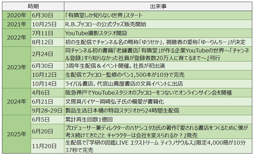 出所:株式会社有隣堂公式サイト「有隣堂しか知らない世界 チャンネル紹介」(閲覧日:2026年1月15日)および株式有隣堂プレスリリース「YouTubeライブで図鑑4,000冊が10分37秒で完売」(公開日:2025年11月21日、閲覧日:2026年1月15日)を元に作成。
