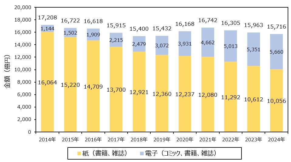 出所:HON.jp「2024年出版市場(紙+電子)は1兆5716億円で前年比1.5%減、コロナ前の2019年比では1.8%増 ~ 出版科学研究所調べ」 より作成(更新日:2025年1月24日、閲覧日:2026年1月5日) (元データの出所は公益社団法人全国出版協会・出版科学研究所)